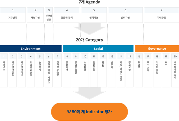 한편, 미래에셋자산운용은 글로벌 투자 전문그룹으로서 고객의 성공적 자산운용과 평안한 노후에 기여한다는 비전 실현의 일환으로 책임투자(Responsible Investment) 원칙을 제정하였습니다. 책임투자는 장기적 관점에서 ESG(환경, 사회, 지배구조)를 자산운용 프로세스에 통합(Integration)하고 수탁자로서의 책임(Stewardship)을 이행하는 투자 철학을 의미합니다. 이를 위해 7개 Agenda와 20개 Category로 구성된 자체 ESG 평가모형을 개발해 활용하고 있습니다.