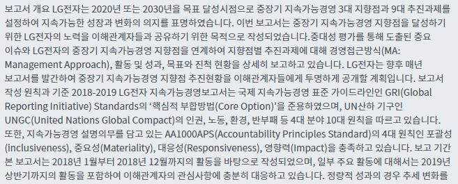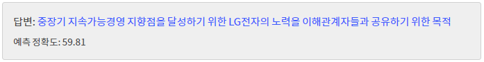 ##### 시사점 저희가 확인해본 결과처럼 현재 인공지능, 특히 자연어 처리를 통한 기계 독해 기술은 일반적이고 범용적인 방식으로 사용자가 필요로 하는 정보를 비교적 정확히 찾아낼 수 있습니다. 정형화된 정보를 추출해야 하는 인간의 입장에서는 A.I를 통해 대량의 정보에 대한 읽기 부담, 판단의 모호함, 실수를 방지할 수 있게 됩니다. 기업 분석 자동화 시대는 생각보다 빠르게 도래할 수 있습니다. 비재무적 정보를 공개하는 기업 입장에서는, 사람 뿐만 아니라 기계 또한 잠재적 독자로 생각하고 정보를 공개해야 할 것입니다. 점차 자동화되는 기업 분석 과정을 고려하여, **보다 기계 친화적인 공시 방식에 대한 고민도 필요할 것입니다.**