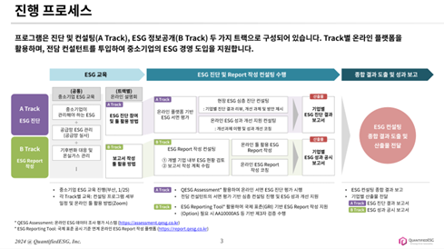 Track B에 참여한 5개 기업은 ESG Reporting Tool을 활용하여 ESG 보고서를 작성하고 공개하는 것을 목적으로 현장방문 및 온라인 컨설팅을 진행하였습니다. ESG Reporting Tool은 글로벌 ESG 공시기준인 GRI, SASB, TCFD의 보고지표를 선택하여 기업이 손쉽게 ESG 공시를 할 수 있도록 지원합니다. 각 기업은 컨설팅을 통해 기업 및 산업별 특성을 고려한 ESG 중요 주제를 도출하고, 이를 기반으로 GRI(Global Reporting Initiative) 보고지표를 선정하였습니다. 보고서의 기획부터 작성까지 전 과정에 걸친 QESG 전문 컨설팅 위원의 코칭으로 5개 기업 모두 완성도 높은 ESG 보고서를 작성하고 공개하였습니다.
