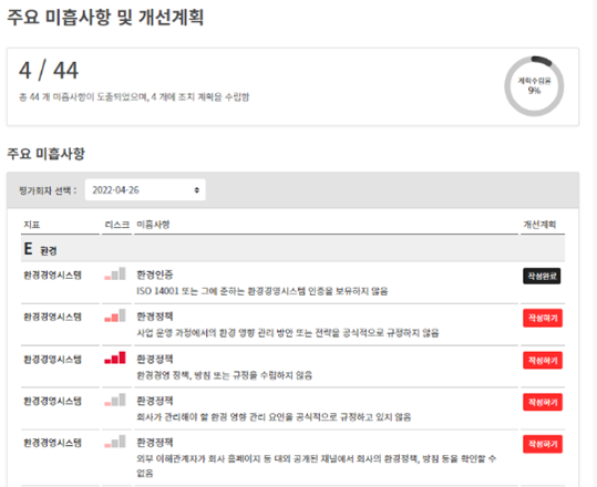 이와 함께 협력사별 ESG 진단 평가를 토대로 주요 위험분석, 개선사항을 권고하고, 협력회사를 위한 개별 진단 보고서를 제공하였습니다.